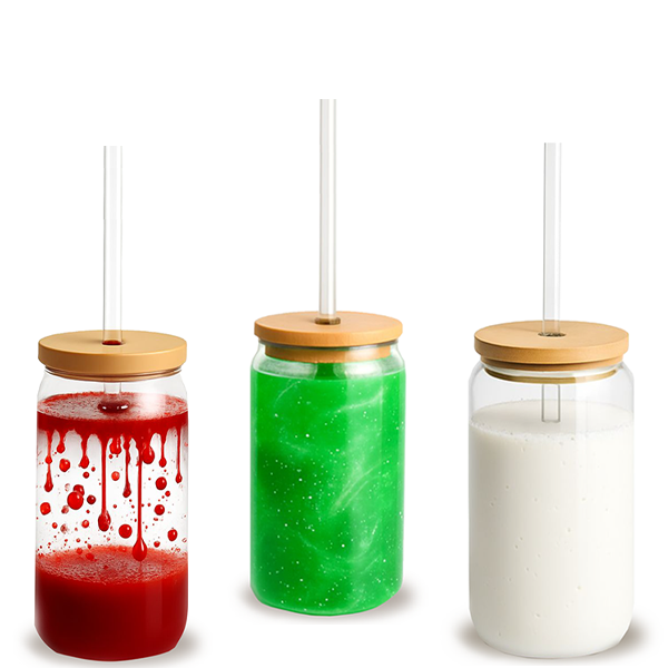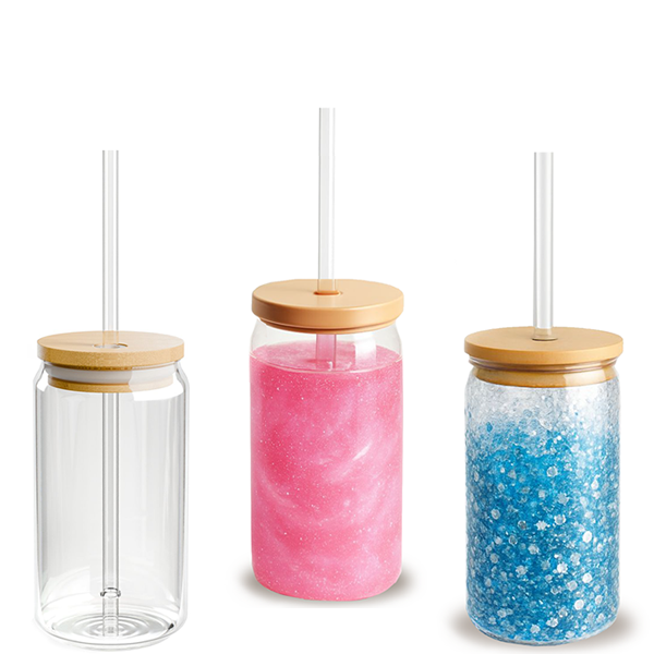 Sip in style with our 16 oz Sipper Jars, available in a durable plastic (perfect for kids and on-the-go sips) or premium glass for a sleek, polished feel. You can also take it up a notch with our Snowglobe Sippers!