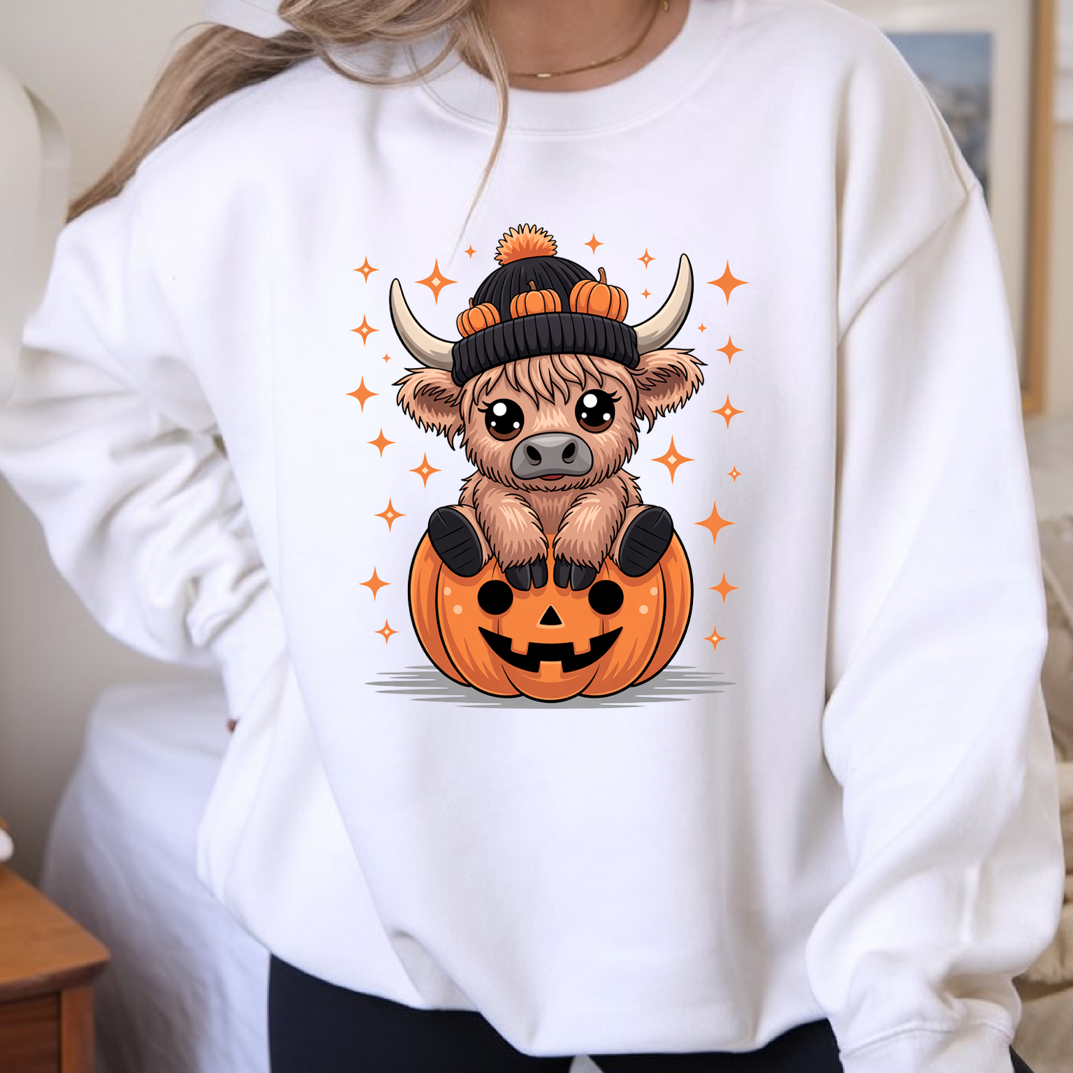 Pumpkin Moo-d is here to steal the Halloween spotlight! This adorable Highland cow is all dressed up for spooky season, perched on a cheerful jack-o’-lantern and ready to bring fall vibes wherever you go. Printed on your choice of cozy tee or sweatshirt, this design is perfect for animal lovers who like their Halloween cute, not creepy!